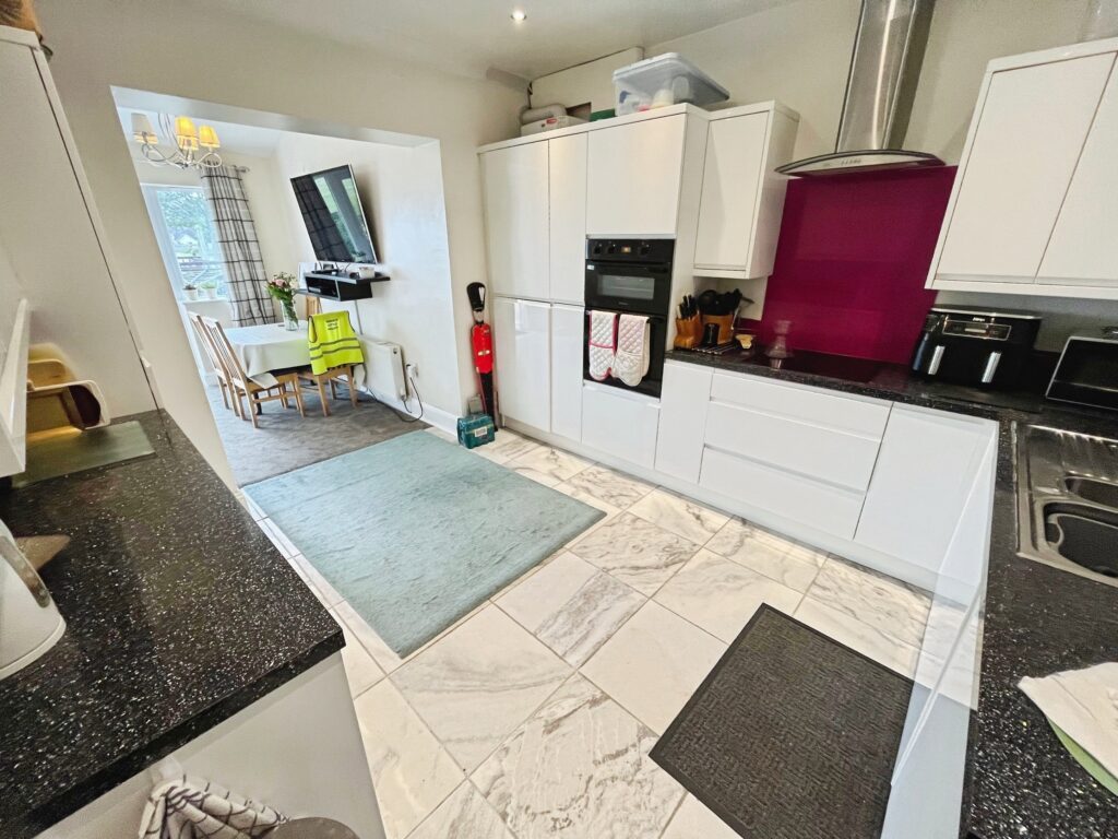 Fitted with a range of wall and base units with complimentary work surfaces over, 1 1/2 drainer sink with mixer tap, integral oven and grill, integral four ring hob with extractor over, space for fridge/ freezer, tiled flooring, spotlights to ceiling, open through to dining room.