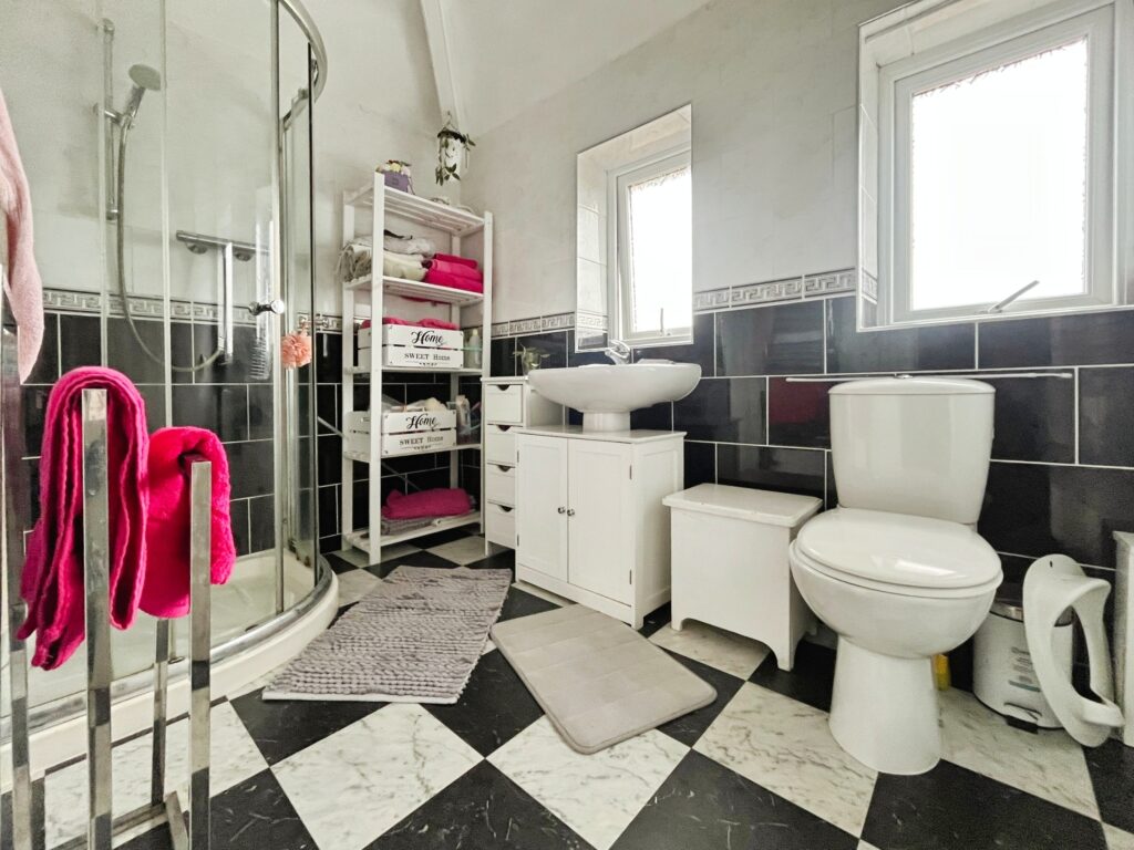 Two double glazed obscure glass windows to rear aspect, corner shower cubicle, pedestal wash hand basin, close couple w.c, tiled walls, heated towel rail, extractor fan, spotlights to ceiling.