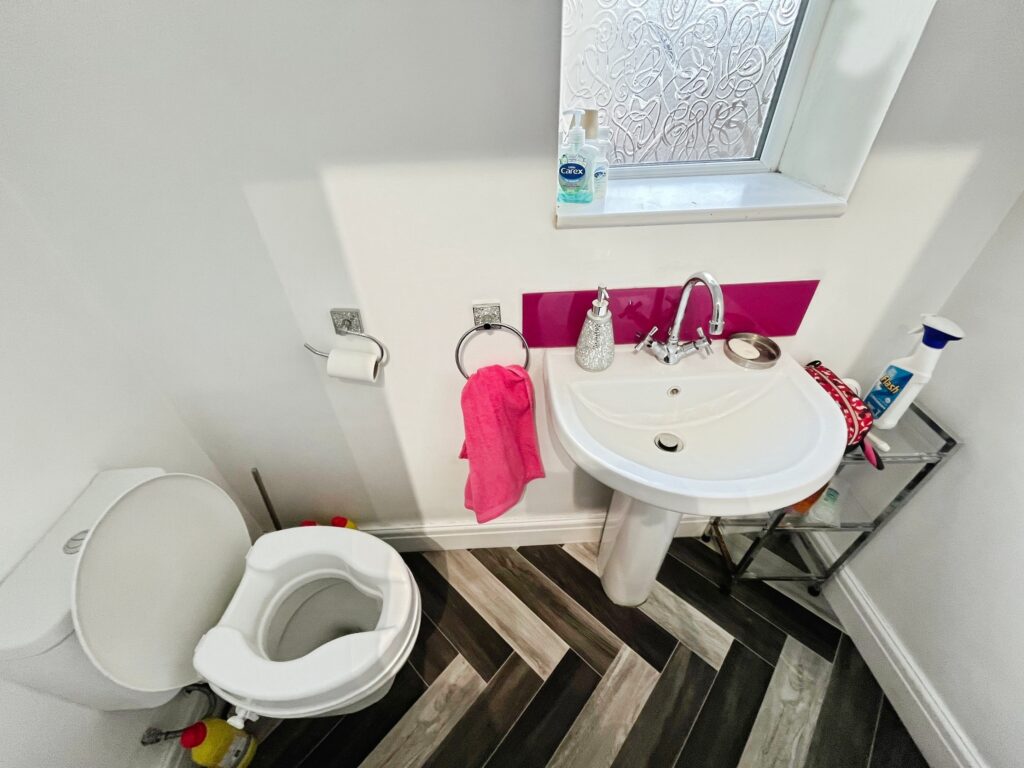 Low level flush w.c, pedestal wash hand basin, extractor fan, double glazed obscure glass window to side aspect.