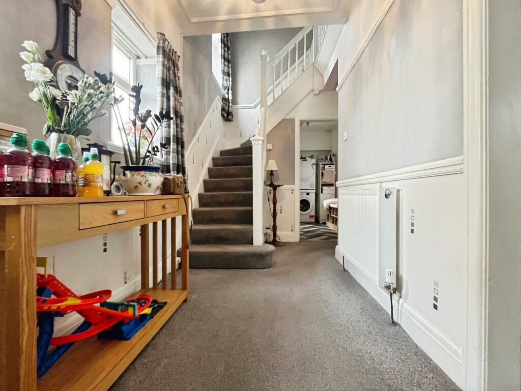 Two double glazed windows to side aspect, cupboard housing electric meter, picture rail, radiator, telephone point, stairs to first floor.