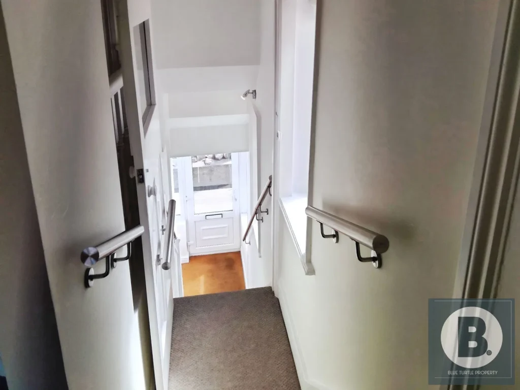 Own secure upvc front door. Hanging rail and shelf, power socket. Stairs with handrail leading up to accommodation.