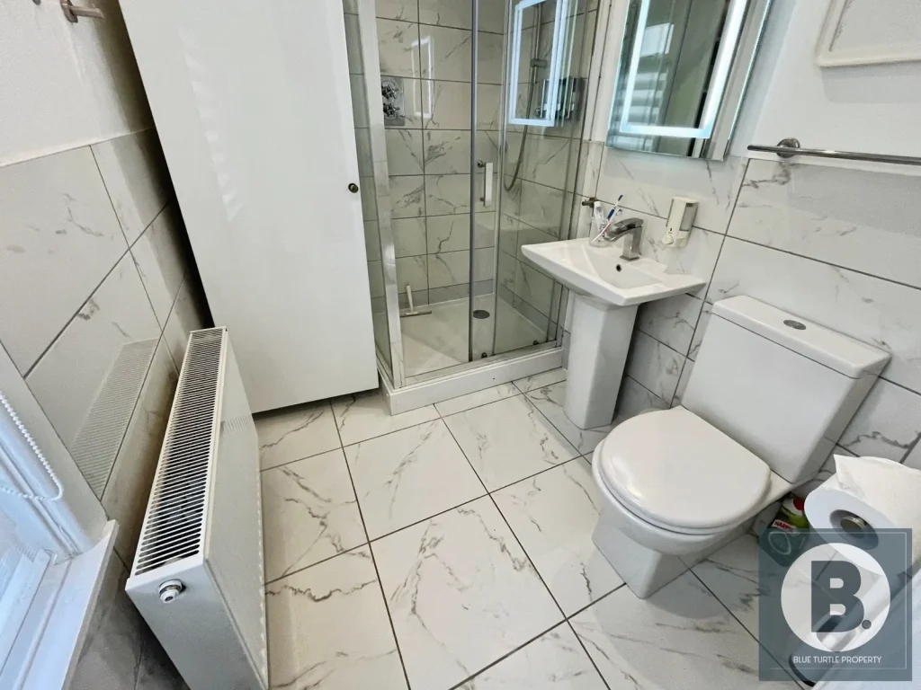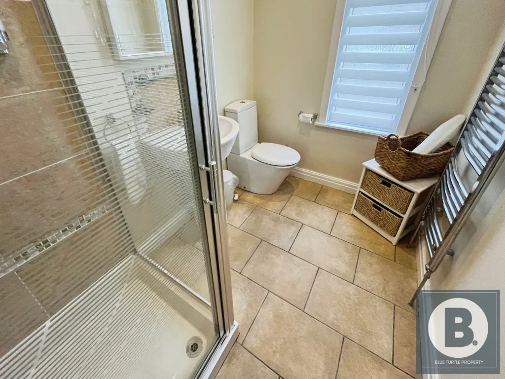 Pedestal wash hand basin with tiled splashback, shower enclosure with tiled surround, low level flush w.c, tiled flooring, heated towel rail, extractor fan, shaver point, double glazed obscure glass window to side aspect.