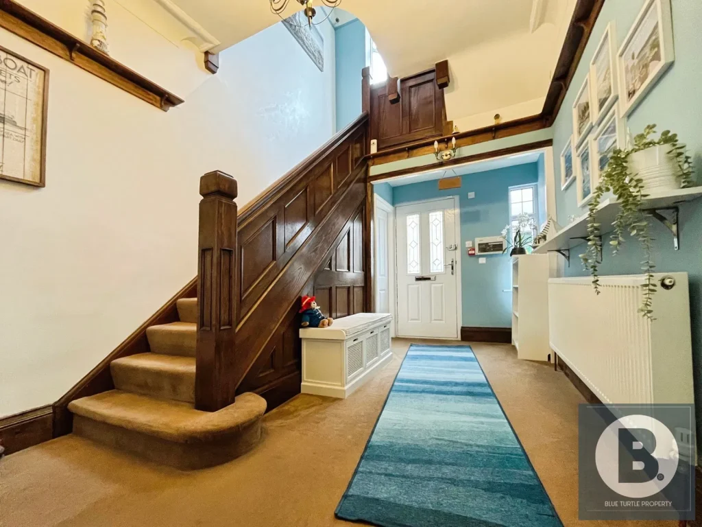Composite door leading in, feature coving to ceiling, double glazed obscure glass window to side aspect, original turned oak staircase to first floor.