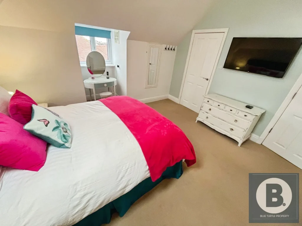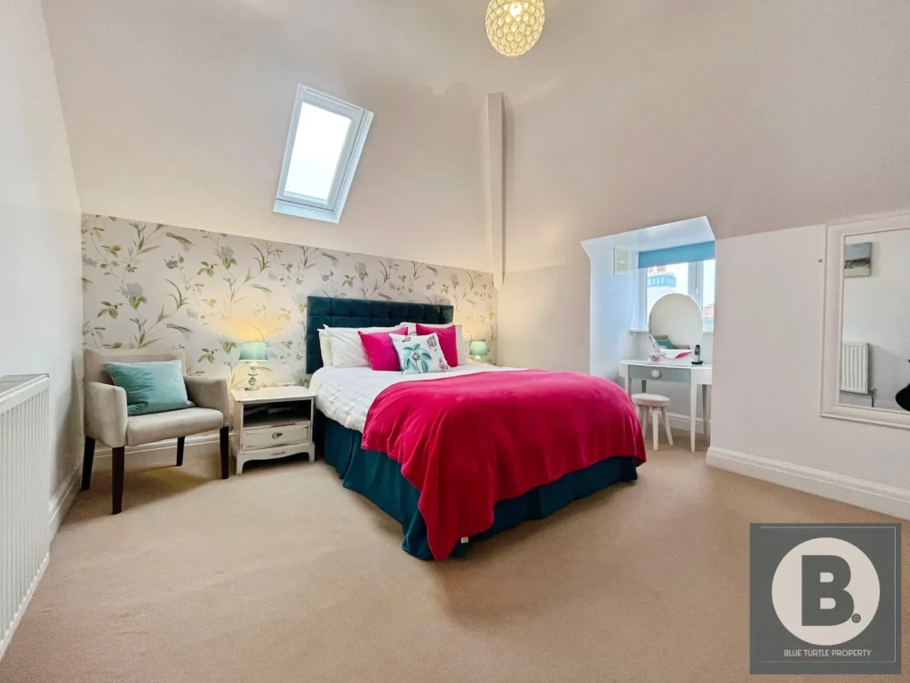 Fitted wardrobe storage, spotlights to ceiling, double glazed window to rear aspect with window seat, radiator, loft access.