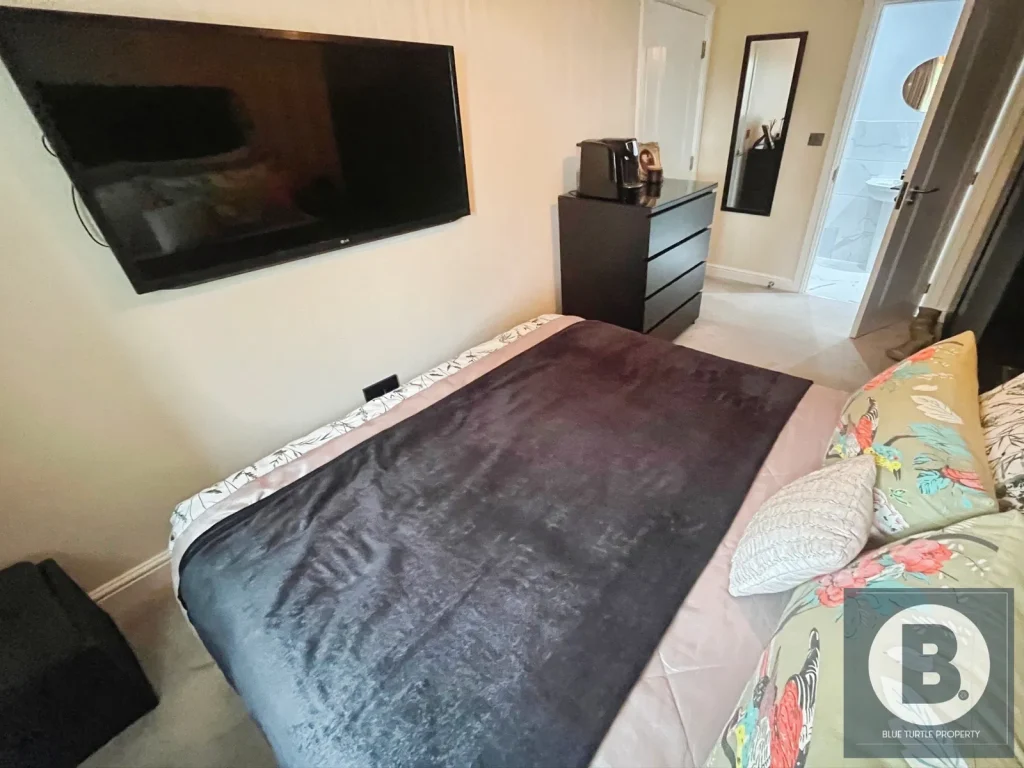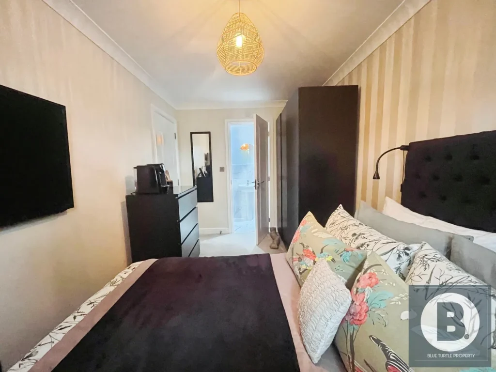 Coving to ceiling, double glazed window to rear aspect, radiator, television point, door through to en-suite shower room.