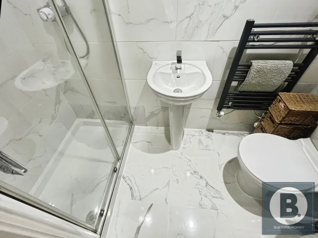 Shower enclosure, pedestal wash hand basin, low level flush w.c, tiled flooring, tiled walls, heated towel rail, shaver point, double glazed obscure glass window to side aspect.