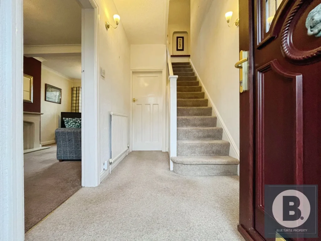 uPVC door leading in, windows with coloured detail to front aspect, radiator, stairs to first floor, telephone point.