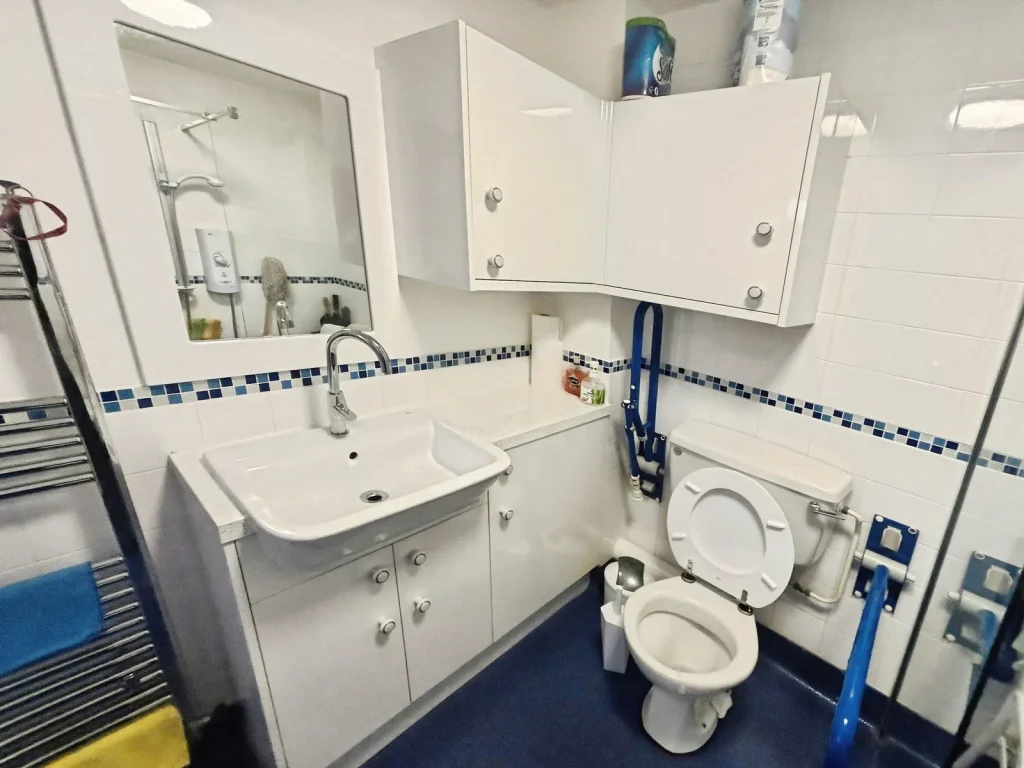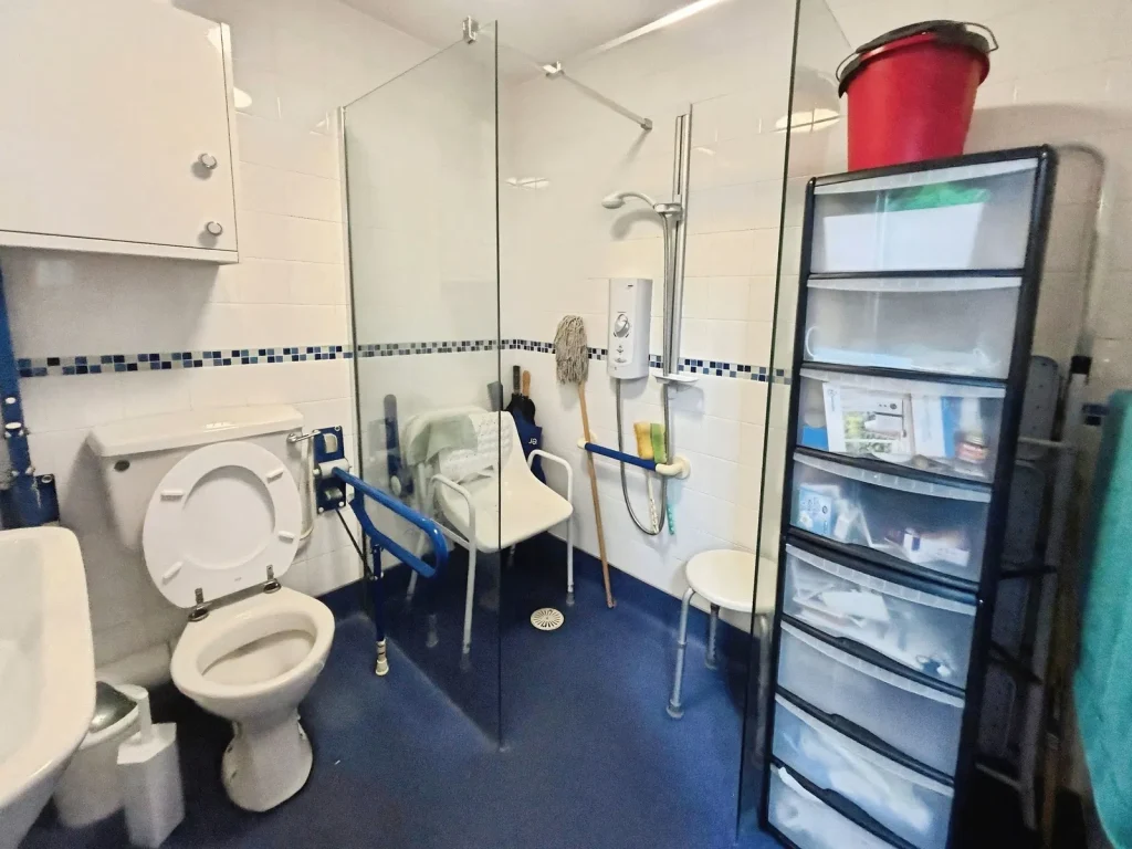 Wet Room (2.08m x 2.05m) – Shower area, wash handbasin, low level flush w.c, tiled walls.