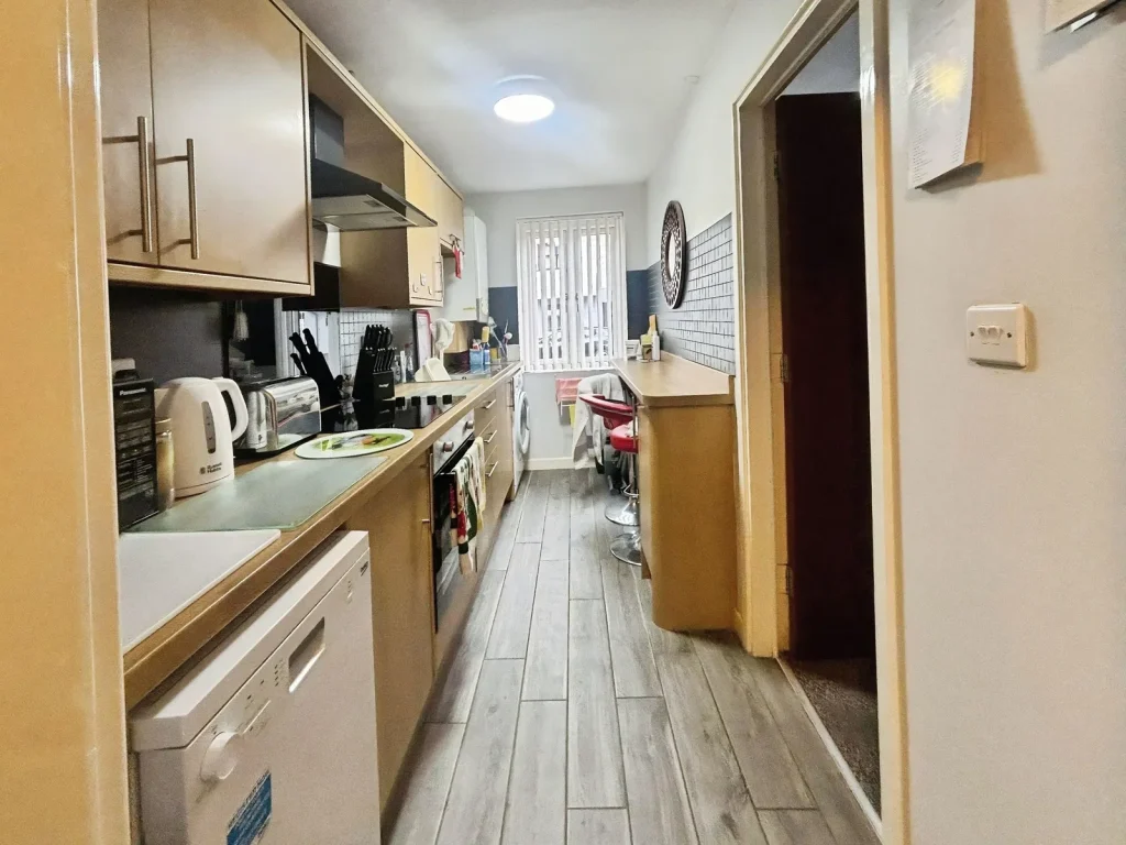 Kitchen (3.58m x 1.63m)- Fitted with a range of wall and base units with complimentary work surfaces over, integral appliances including: oven ,hob and extractor fan, cupboard housing gas central heating boiler, double glazed window to front aspect.