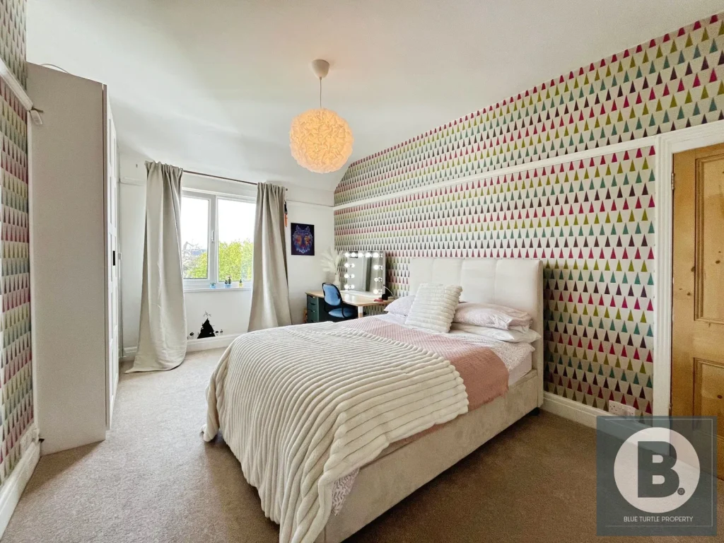 Bedroom 1 (15’9″ x 13’1″ / 4.8 x 4 m): Double glazed bay window to front aspect, built-in wardrobe storage, picture rail, radiator.