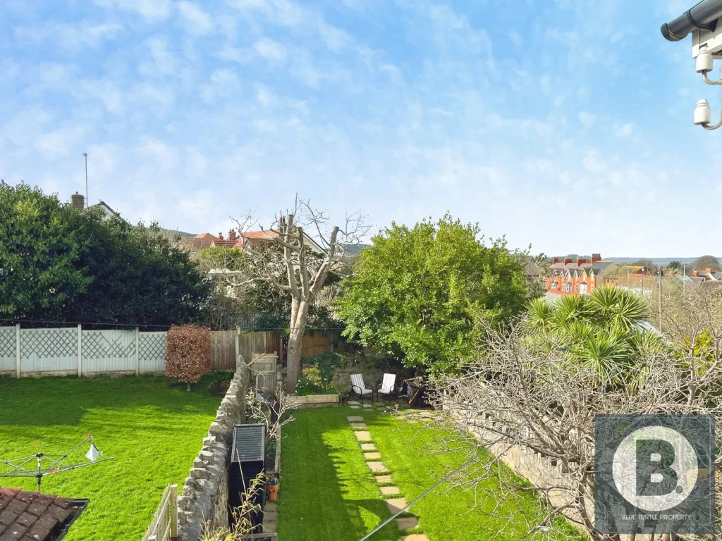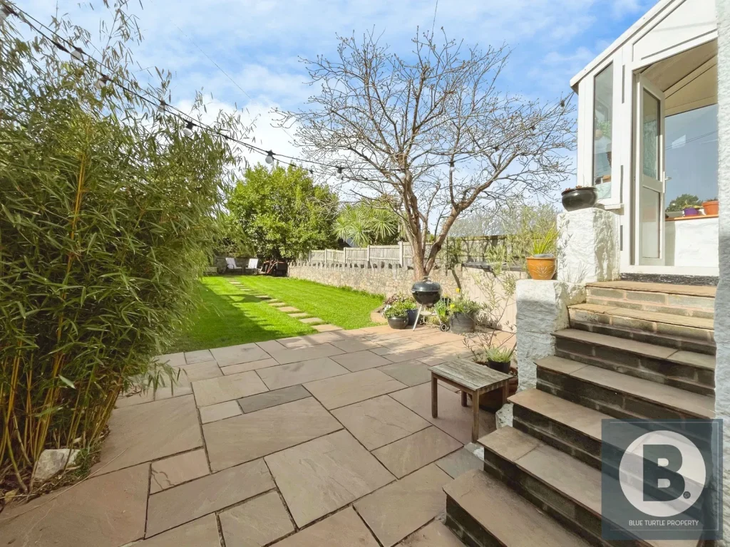 Rear – Porch with stairs leading down to a long, well-maintained garden laid to lawn with mature trees, including a cherry blossom tree. A paved patio area provides an ideal space for outdoor seating, BBQs, and entertaining, while in the evening the garden is beautifully bathed in sunlight, offering a peaceful and welcoming outdoor space within tranquil surroundings. Gated access adds privacy and security.